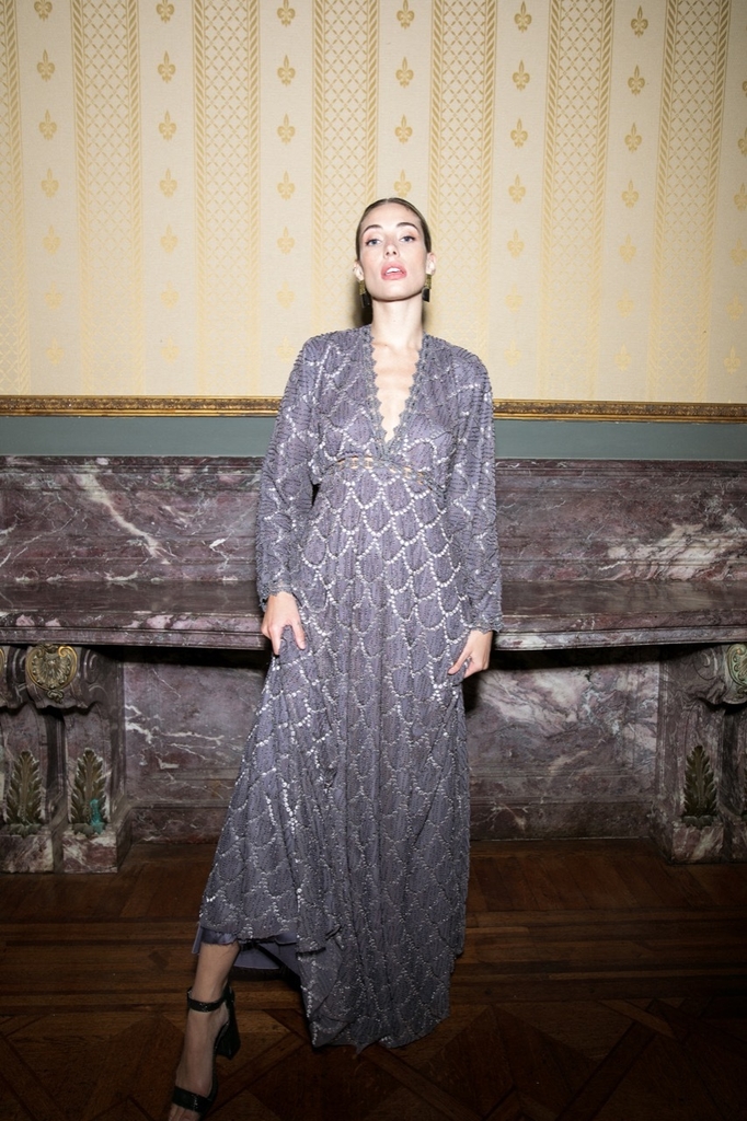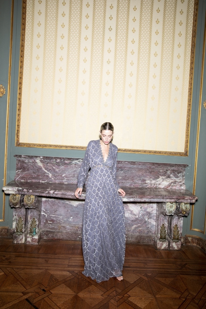 Vestido largo confeccionado íntegramente en pedrería con detalles en puntilla